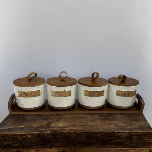 Rustic 4 Pcs Ceramic Jar Set with Wooden Tray | Adornia.pk
