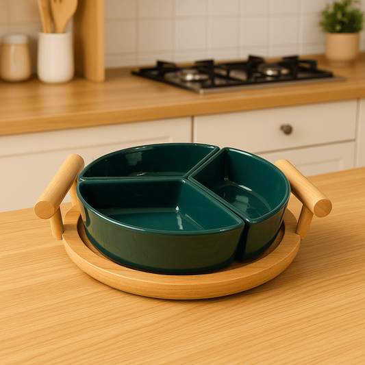Luxury Green 3-Partition Ceramic Serving Tray with Wooden Base | Elegant Appetizer & Snack Platter