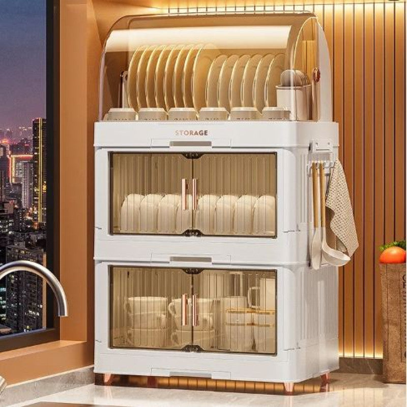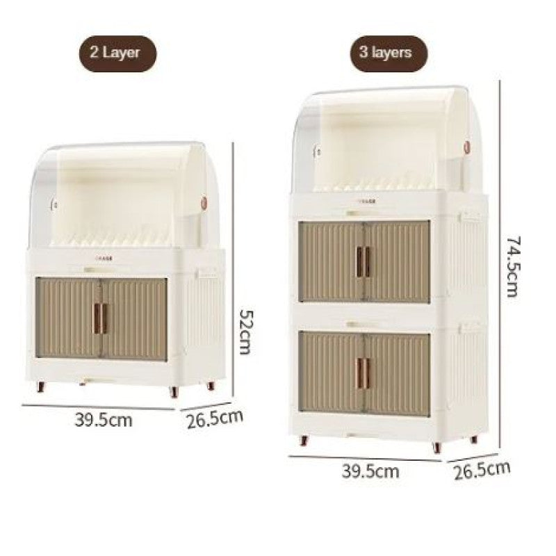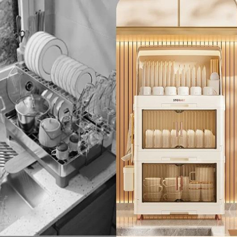 • Multi-Layer DesignUpper rack for plates, middle shelf for bowls, and lower shelf for cups and utensils.