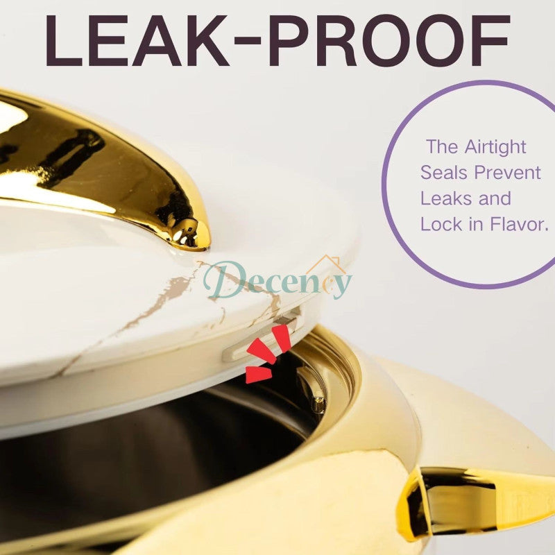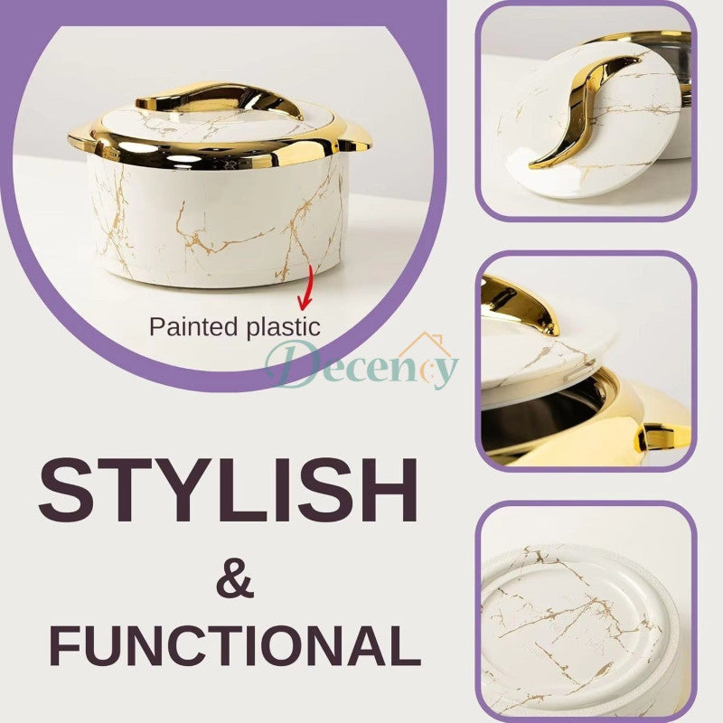 This thermal serving set includes three casserole sizes: 1.5L, 2.0L, and 2.5L, perfect for daily use, dinner parties, events, and outdoor gatherings. The elegant white body with gold swirl accents adds a sophisticated touch to any table. The airtight lids lock in temperature and flavor, while the BPA-free ABS plastic exterior ensures safety and durability.