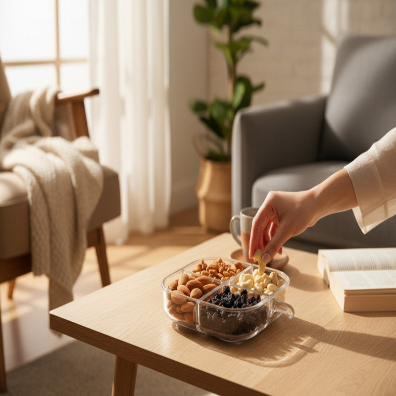 4-Grid Transparent Snack & Sauce Serving Tray – Premium Plastic Compartments for Dry Fruits & Snacks | Adornia.pk