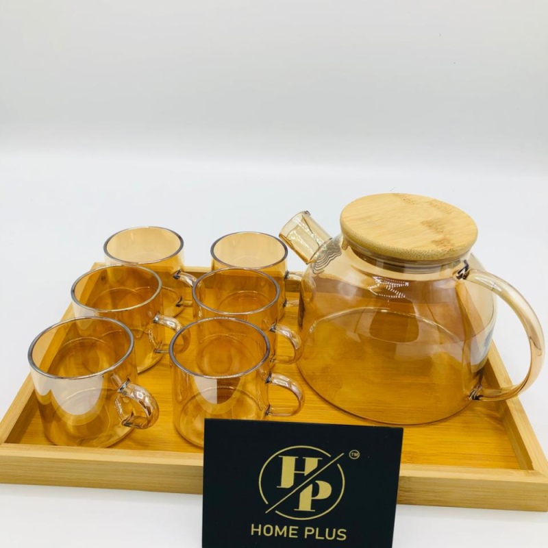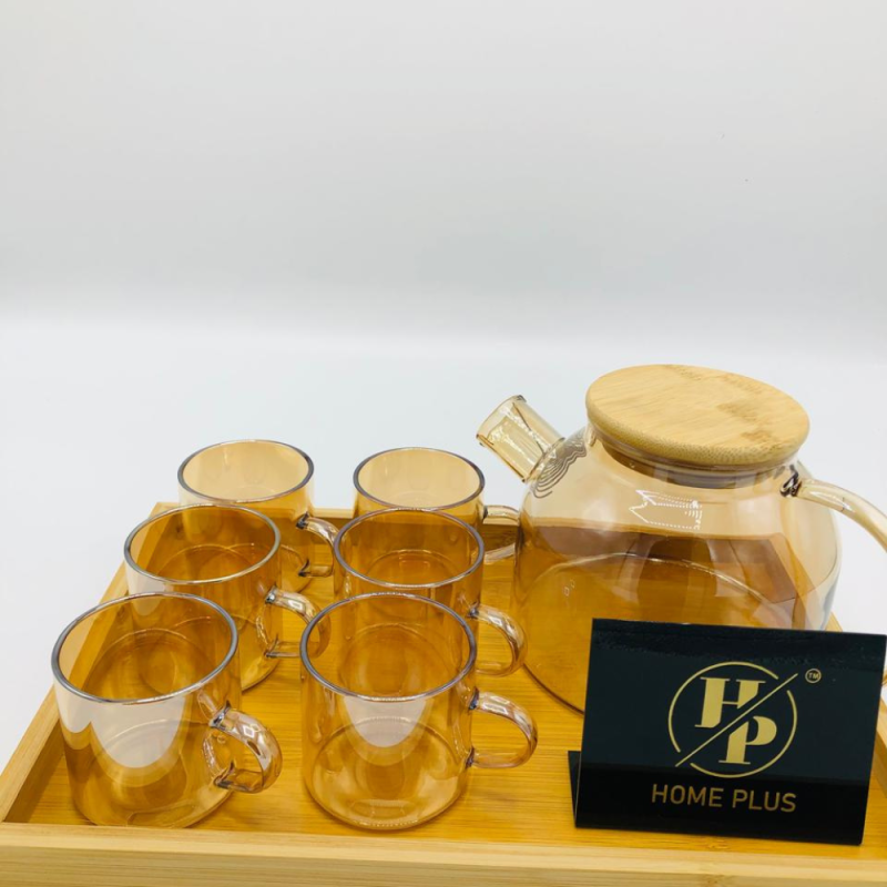 Experience the warmth of traditional Kehva serving with our exquisite 8-piece set, featuring 6 borosilicate glass mugs, 1 stainless steel kettle, and 1 bamboo tray.