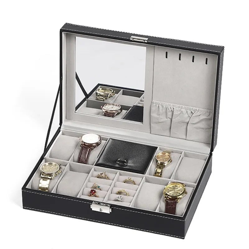 . Watch box material: black PU leather, density board box embryo, gray flannel lining, window glass material.