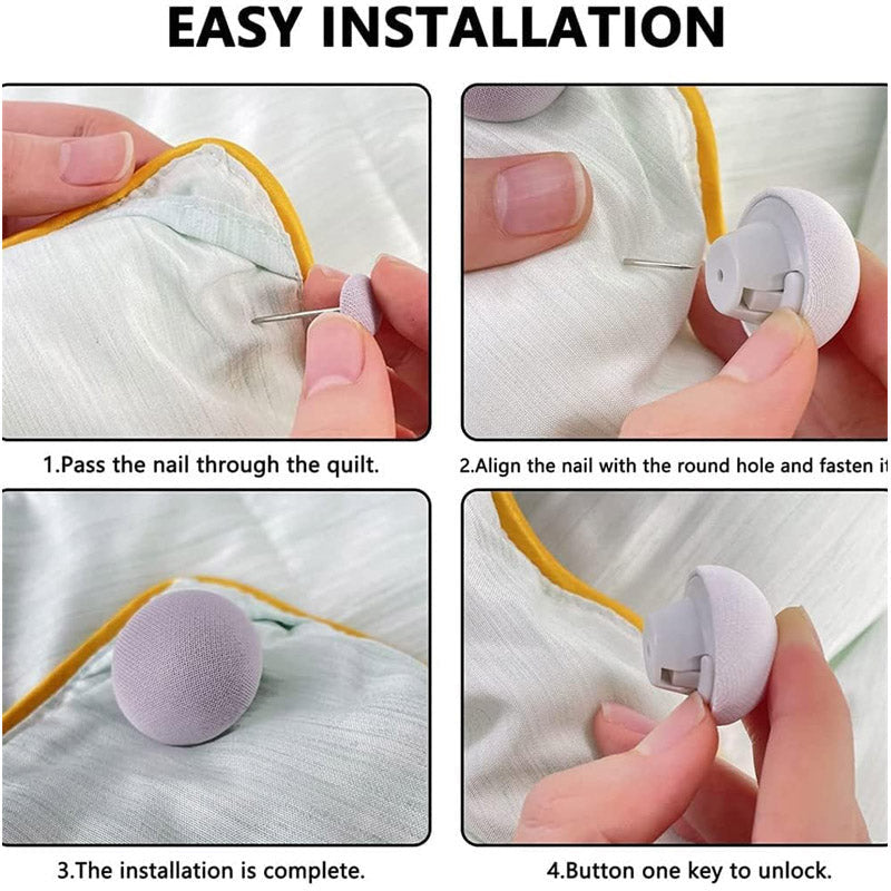- You only need to pass the needle through the quilt and put the nail in the round hole on the other end to fix it.When you want to remove it,you can press the button to unlock it directly, which is very easy to remove.