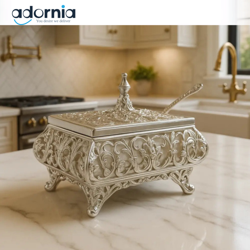 Elevate your kitchen decor with the Royal Silver Sugar Server, a beautifully crafted piece featuring intricate embossed floral patterns and a matching silver spoon. Perfect for serving sugar, salt, or dry condiments, this elegant container combines functionality with timeless design. Its antique silver finish and detailed craftsmanship make it a standout addition to luxury kitchens, tea setups, and formal dining occasions.