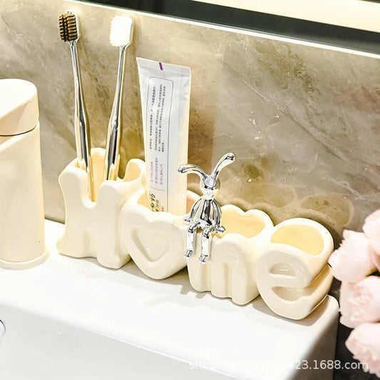 “HOME” Ceramic Toothbrush Holder – Cute & Decorative Bathroom Organizer
