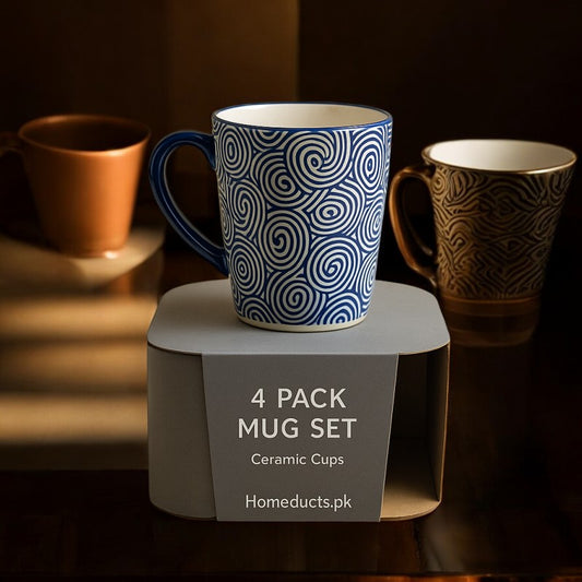 Premium 4-Piece Ceramic Mug Set – Blue Patterned Coffee & Tea Cups | Adornia.pk