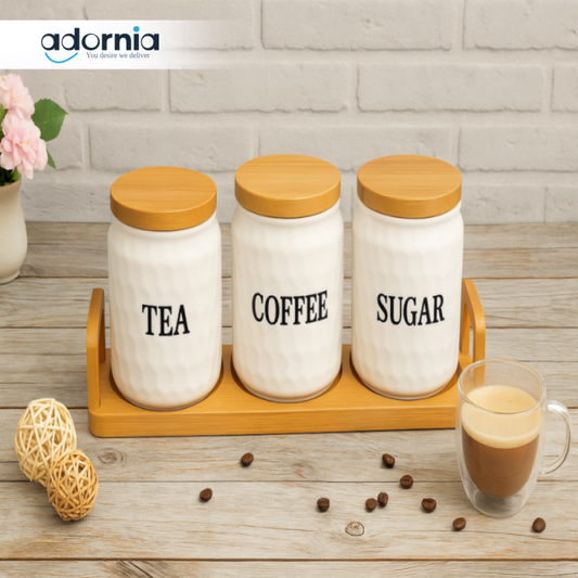 Modern Ceramic Jar Set with Bamboo Stand – Tea, Sugar & Coffee Containers | Adornia.pk