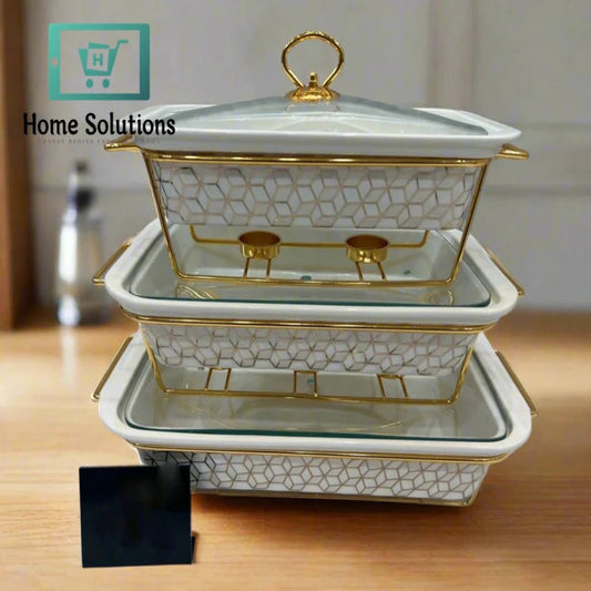 3-Piece Rectangular Ceramic Chafing Dish Set – Gold Pattern Casserole with Stand