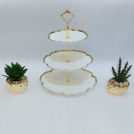 Elegant 3-Tier Ceramic Pastry Stand with Iron Base – Golden Accents