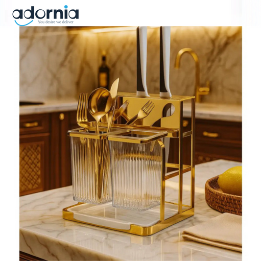 Premium Gold Glass Cutlery Holder Set – Dual Kitchen Utensil Organizer