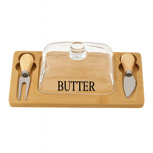 Butter Dish and Cheese Knife Set with Bamboo Base and Glass Lid