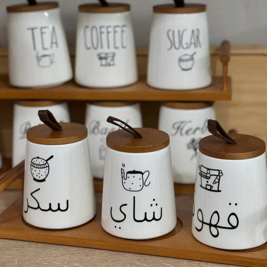 Modern Ceramic Jar Set with Bamboo Stand – Tea, Sugar & Coffee Containers | Adornia.pk