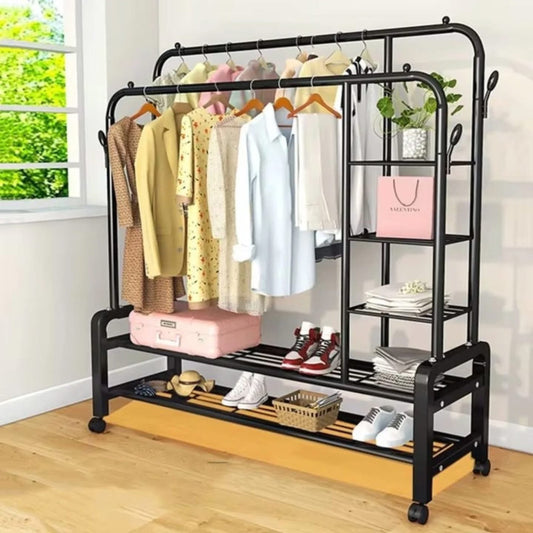 Dual Pole Movable Clothes Rack – Wardrobe Stand with Shelves & Coat Storage