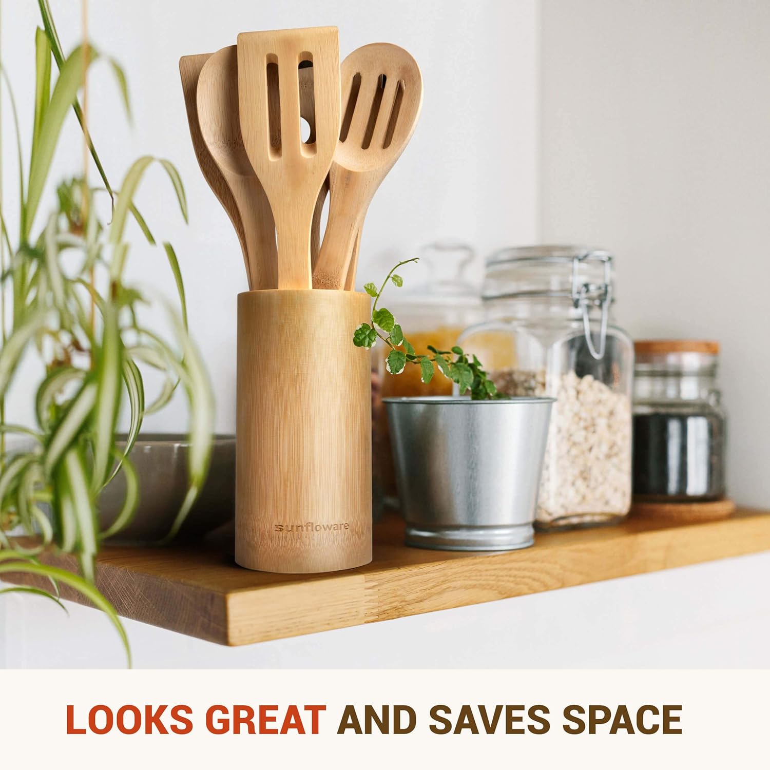 Bamboo Kitchen Utensils, 7Pcs Cooking Utensils Set with Holder