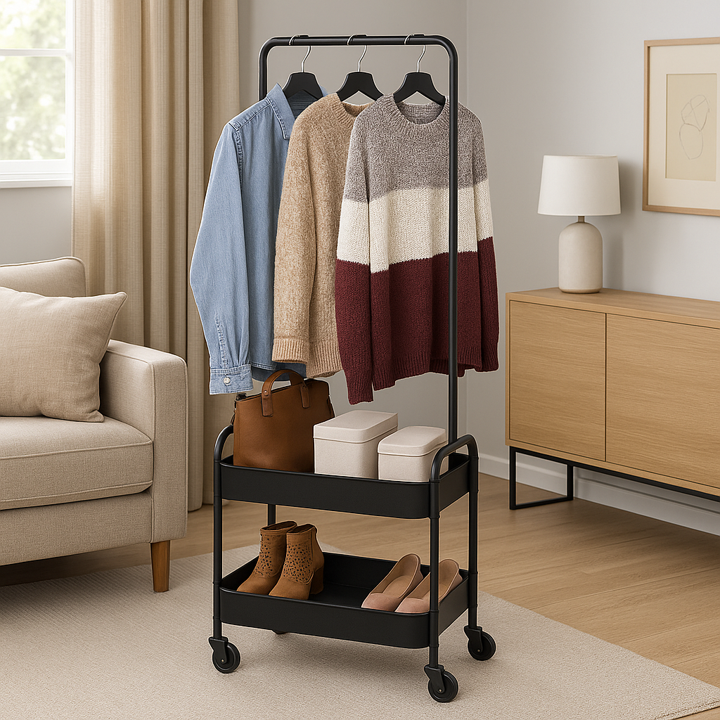 STURDY FRAME: Made of carbon steel and PP, the reinforced design of this clothing rack can carry a variety of clothes, shoes, bags and caps, which is solid to hold heavy items, durable to use for many years. There are 4 heavy duty wheels with 360 degrees rotation and premium quality for better loading capacity and stability.