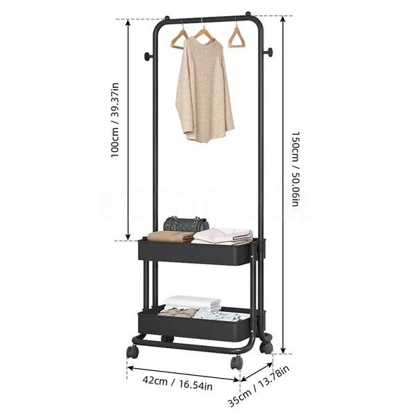 3-IN-1 VERSATILE DESIGN: Equipped with a hanging zone, 2 baskets and 2 cute hooks, this 3 in 1 free standing organizer can serve as coat rack, garment rack, shoe rack, etc. The hanging zone can hang your clothes without getting it crumpled or creased, double baskets provide extra storage for shoes, boxes, folded clothes and hooks for your keys, umbrella, caps, bags and other items.