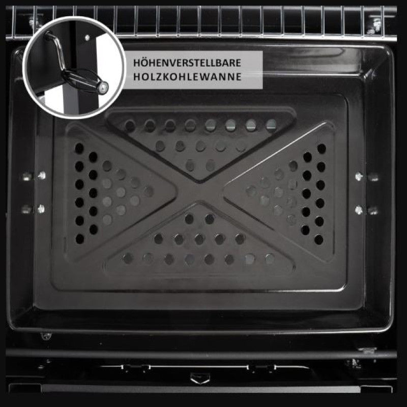 - Material | Both the grill grate and the heat retention grate are made of steel. With its weight of 22.4 kg approx. the charcoal grill is particularly robust and durable. With the included wheels, the grill is also easy to transport.