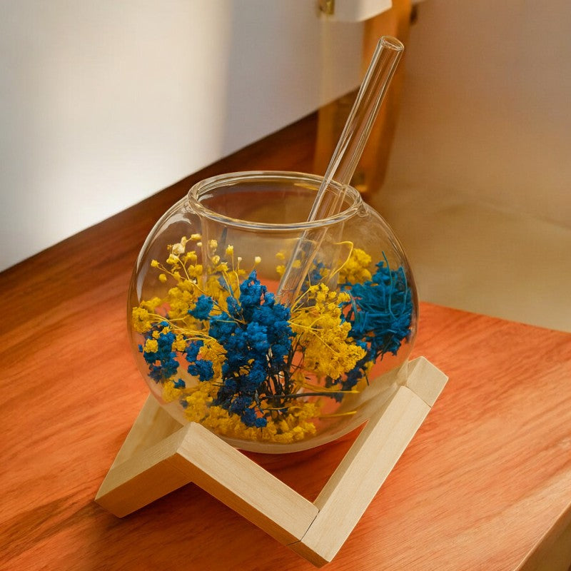 GlassLux Double-Wall Glass Coffee Cup with Straw & Wooden Stand – Heat Resistant | Adornia.pk