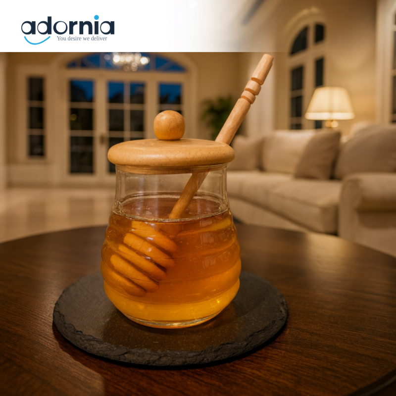 Enhance your kitchen or dining area with this premium Honey Jar complete with a wooden dipper. Designed for easy and precise honey serving, its elegant build ensures minimal mess and maximum convenience. This functional decor piece combines practicality with aesthetic appeal, making it an expert choice for honey lovers and stylish kitchens alike.