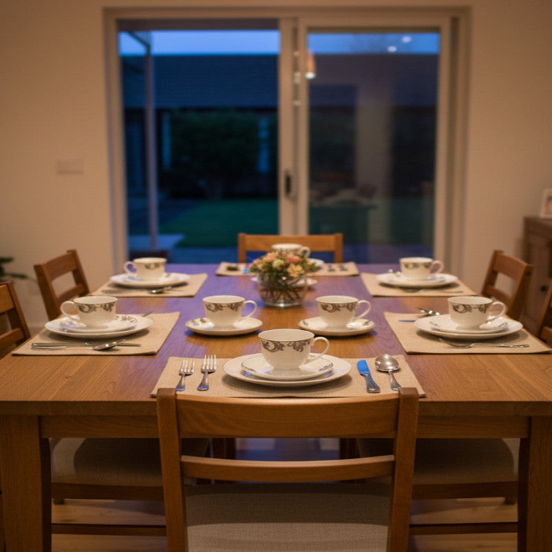 An elegant porcelain cup, adorned with a graceful floral design, holds steaming green tea served with slices of fresh lemon on the saucer. The cozy living room setting — complete with a classic armchair, bookshelf, and soft natural light — enhances the warm, inviting mood. Imagine this refined charm extended to six matching cups, perfect for hosting guests and sharing moments of relaxation, health, and hospitality.