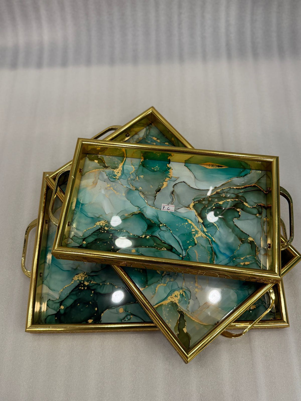 1 x Luxury 3-Piece Green and Gold Abstract/Marble Serving Tray Set.