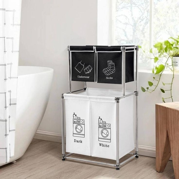 VERSATILE : This laundry sorter basket helps you to organize laundry effortlessly, allowing you to sort underwear, socks, dark, and white conveniently, streamlining your laundry routine by pre-sorting clothes as they accumulate, making laundry day a breeze. Not just for laundry. Use it for storing toys, sports equipment, or other household items to keep your space tidy and organized. Besides, its sleek design complements any decor, enhancing the aesthetics of your laundry area