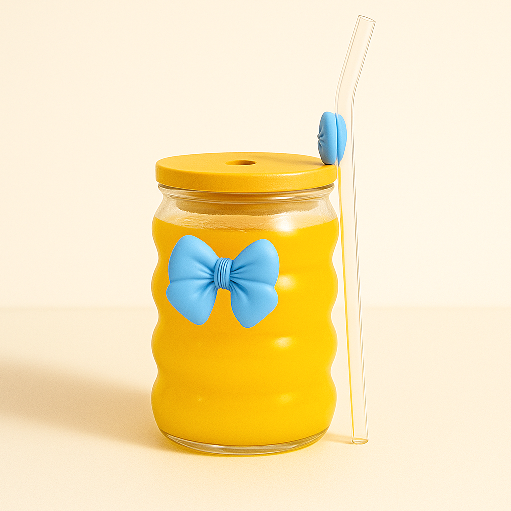 The glass features a durable borosilicate body—perfectly clear and lightweight—topped with a natural bamboo lid and a reusable glass straw, making it both eco-friendly and stylish. The signature pastel bow detail adds a cute, Nordic-inspired accent that stands out beautifully against beverages of any color—from fresh juices and smoothies to iced lattes and teas.