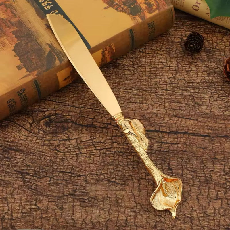 A cake knife with a unique design typically features a blend of functionality and artistic flair. These are made up of metal. Some unique cake knives have handles adorned with gemstone accents & detailed carvings. The blade itself is typically slender, often with a slight curve to make slicing through delicate cakes or pastries easier. The overall design could reflect a particular theme, such as vintage, modern, or nature-inspired motifs, making it both a practical tool and a statement piece for weddings, anniversaries, or special occasions. Some designs may even include matching servers, creating a cohesive and stylish set.
